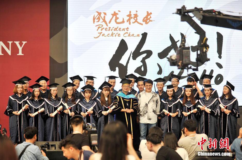 6月5日,影視明星成龍來武漢參加成龍影視傳媒學院2016年畢業典禮,與學生交流分享自己的人生經驗。他勸勉大學生們:“要好好學習各種技能,不要懷疑自己。希望你們任何時候都要努力學習,畢業之后也要做一個復合型人才,有目標就不要放棄。”鐘欣 攝