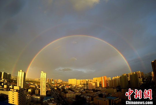 6月14日,經(jīng)過(guò)一場(chǎng)短時(shí)暴雨后,山西太原上空出現(xiàn)雙彩虹景觀。中新社記者 韋亮 攝