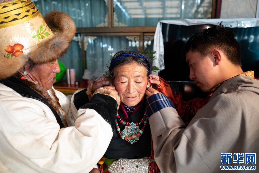 1月14日,在位于嘎吉林村安置點的新家中,村民普赤(中)在家人的幫助下戴耳環。新華社記者 普布扎西 攝