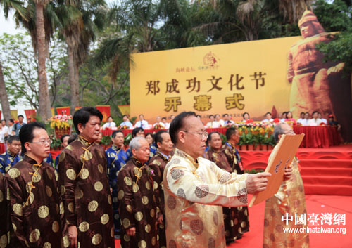 5月17日,來(lái)自海峽兩岸的民眾在廈門思明區(qū)鼓浪嶼舉行盛大頌典,共祭民族英雄鄭成功。由此,正式拉開(kāi)了“鄭成功文化節(jié)”的大幕。圖為主祭人念祭文。(中國(guó)臺(tái)灣網(wǎng) 邵磌 攝)