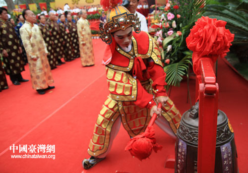 “鼓初嚴(yán)、再嚴(yán)、三嚴(yán)”,在大陸主祭人鄭家麟和臺(tái)灣主祭人、奉祀鄭成功聯(lián)合會(huì)理事長(zhǎng)簡(jiǎn)慶雄的率領(lǐng)下,兩岸52位陪祭、同祭人行禮如儀。國(guó)家文化部副部長(zhǎng)趙少華、博鰲亞洲論壇秘書長(zhǎng)龍永圖等,以及來(lái)自兩岸的數(shù)百位民眾亦全體肅立,向民族英雄致敬。