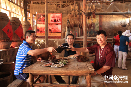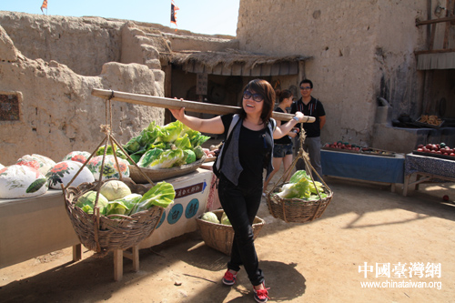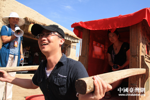 中國臺灣網7月26日銀川消息 挑菜、抬轎、打鐵,舉壇暢飲、把酒言歡,模仿著名影視劇中人物造型,兩岸媒體寧夏南部行的記者昨日上午在銀川鎮北堡西部影城暢快游玩,將《紅高粱》中張藝謀為鞏俐說戲的場景和周星馳在《大話西游》中的經典造型風趣地體現出來。