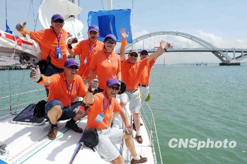 記者在廈門五緣灣看到,十五艘帆船同時升起主帆,彩旗飄飄、運動員進行曲激昂,水手整齊列隊站在甲板上接受海峽兩岸貴賓檢閱;廈門口岸、邊檢、海事、海關、檢驗檢疫等部門的工作人員為參賽船只、船員快速辦理出關離港手續。