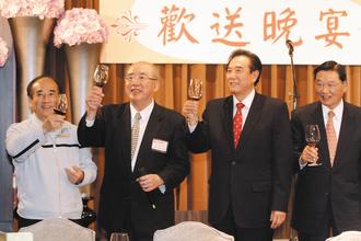 國民黨榮譽(yù)主席吳伯雄(左二)昨晚設(shè)宴歡送海協(xié)會(huì)會(huì)長陳云林(右二),與“立法院長”王金平(左一)、海基會(huì)董事長江丙坤(右一),一同舉杯。