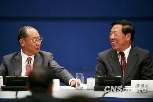 資料圖:2010年4月11日,博鰲亞洲論壇舉行“兩岸企業家圓桌會議:兩岸簽訂ECFA后的商機”分論壇。全國社會保障基金理事會理事長戴相龍(右)與兩岸共同市場基金會最高顧問錢復(左)共同主持會議。 中新社發 陸欣 攝