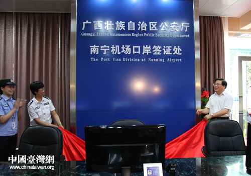 中國臺灣網6月26日南寧消息 日前,臺灣居民口岸簽注啟動暨廣西壯族自治區公安廳南寧機場口岸簽證處揭牌儀式在南寧吳圩國際機場隆重舉行。廣西壯族自治區副主席、公安廳黨委書記、廳長梁勝利,公安部出入境管理局副局長朱際青等領導出席并致詞。自治區、南寧市有關部門領導,部分在邕旅行社代表,公安民警代表共250人參加了啟動儀式。