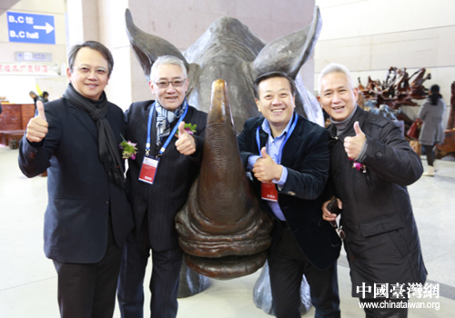 嘉賓們在威海文博會現場銅制犀牛前合影。(威海市臺辦 王建利 攝)