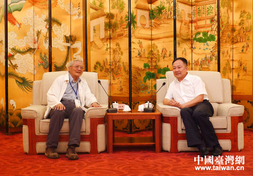 8月18日晚,陜西省委常委、省委統戰部部長陳強在西安會見了臺灣促進中國現代化學術研究基金會學術交流團翟宗泉一行。(陜西省臺辦袁永明 攝)