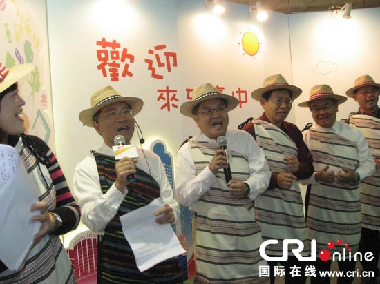 蔡炳坤(左2)與團(tuán)隊其他成員,身著泰雅族傳統(tǒng)披肩,戴著大甲藺草帽,高歌迎賓曲“梨山癡情花”,全力行銷臺中特色