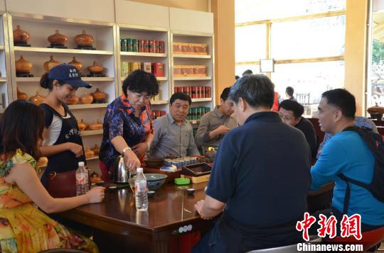 游客在臺灣美食工藝品館開心地泡茶。(劉雨 攝)