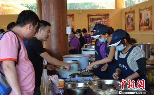 游客在臺灣美食工藝品館品嘗臺灣小吃。(劉雨 攝)
