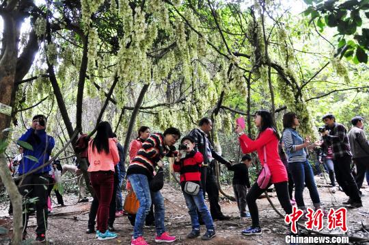 廣東東莞清溪鎮第四屆賞花行16日拉開帷幕,活動吸引了來自粵港臺兩岸三地的游客前來踏青賞花。圖為游客登山入林賞禾雀花。 李獲 攝