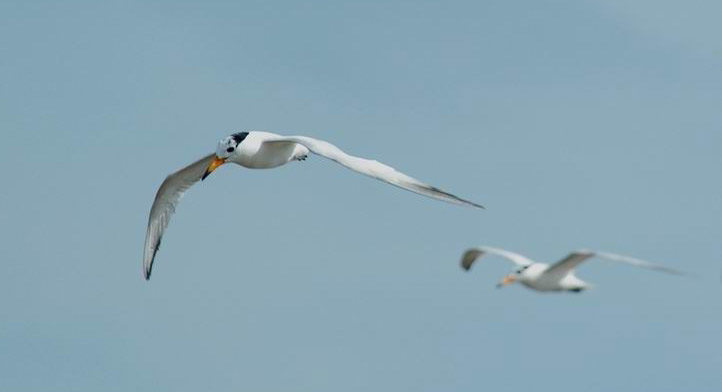 “一直到中午,我們都在靜靜地觀鳥。突然兩只嘴尖黑黑的鳥出現(xiàn)在一群紅嘴巨鷗當(dāng)中。我當(dāng)時就判斷這是兩只中華鳳頭燕鷗!蹦吖廨x回憶說。