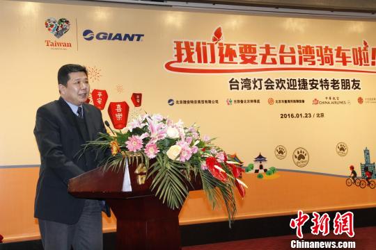 1月23日,臺灣海峽兩岸觀光旅游協會北京辦事處與臺資企業北京捷安特公司異業合作,舉辦“我們還要去臺灣騎車啦——臺灣燈會歡迎捷安特老朋友”優質行程推介會。圖為北京市臺辦主任汪明浩致辭。 陳小愿 攝