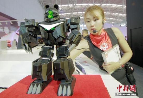 7月7日,由天津市政府和臺灣貿易中心主辦的2016天津臺灣名品博覽會在天津梅江會展中開幕。今年的“臺灣精品館”特別選取了53家知名臺企的111件頂尖產品參展,分別涵蓋智能科技、健康照護、運動樂活、環保生活等多個方面。圖為展出的臺灣黑熊機器人。中新社記者佟郁 攝