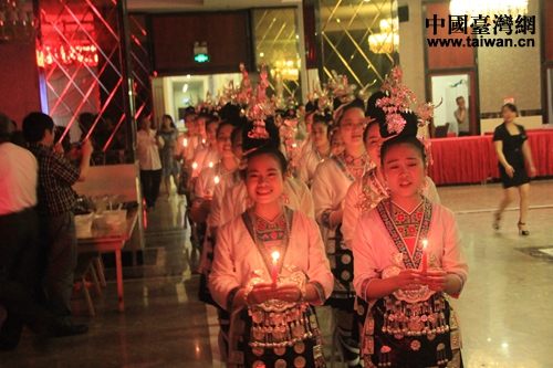 30名侗族姑娘唱著生日快樂歌走進大廳(中國臺灣網(wǎng) 蕪同 攝)