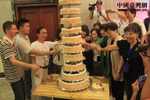 忽然,大廳的燈光熄滅了,大家正在驚奇時,只見朦朧中30位身穿潔白侗族服裝的姑娘,每人手中捧著一支蠟燭,唱著侗語的生日快樂歌走了進來。原來,細心的主人是為14位7月生日的兩岸嘉賓集體過生日。與姑娘們一起,被推進來的還有16層的巨大生日蛋糕。