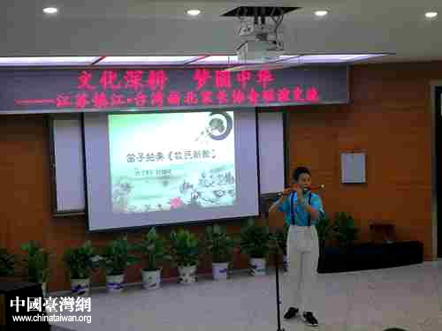 鎮(zhèn)江中華路小學(xué)生在交流會(huì)上展示笛子演奏。(鎮(zhèn)江市臺(tái)辦 章邦勇 攝)