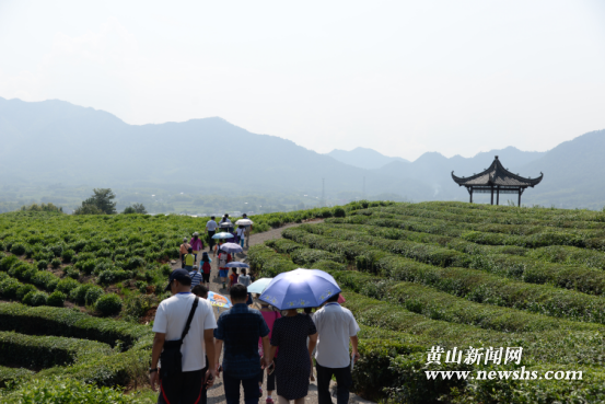 在路西村景區,考察團參觀了空中生態茶園、千年古埂、濱河公園等地。盤山而上,修剪得別具一格的茶樹讓人眼前一亮,它宛若跳躍的曲譜,又好似山間騰起的波浪。對于這種奇特的茶園景觀,考察團團員們連連稱贊。