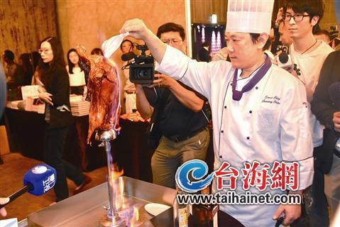 東南網4月26日訊(海峽導報駐臺記者 林連金 文/圖)火焰片皮鴨、黃金龍蝦泡香米、茶香嫩子雞、布袋鳳吞魚翅羹、香燜稻草西施牛……昨日上午,第七屆海峽兩岸美食文化交流論壇在臺北登場,兩岸百余家知名餐飲企業參與,目標只有一個,那就是如何攜手同進,實現“中華美食,全球共享”。