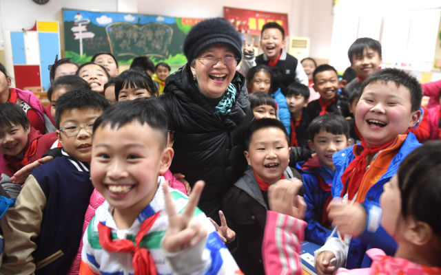 武漢外國語學校美加分校的孩子們和“校董奶奶”蕭永瑞在一起。(新華社記者程敏攝)