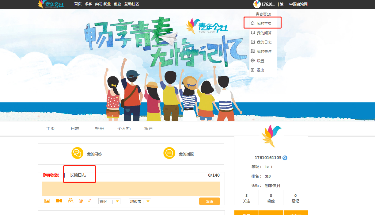1.在電腦上(劃重點:電腦上)打開青年公社(http://y.taiwan.cn),使用郵箱或者手機號碼進行注冊,成為青年公社尊貴會員!然后登錄“個人主頁”發表“長篇日志”。