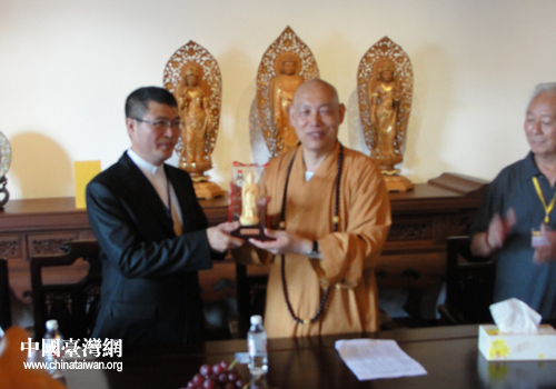 臺(tái)灣金蘭會(huì)會(huì)長(zhǎng)臺(tái)南正統(tǒng)鹿耳門圣母廟主委王增榮與普陀山佛教協(xié)會(huì)會(huì)長(zhǎng)道慈大和尚代表雙方互換禮物(圖片來源:舟山市臺(tái)辦)
