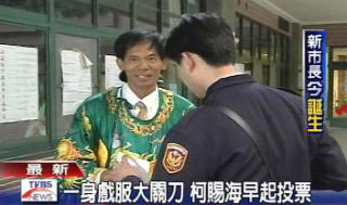無黨籍的臺北市長候選人、“抗議天王”柯賜海一早就到他戶籍所在地永安小學投票,他不改以往的風格,依然一身戲服帶著關刀,還有一只黑狗,但馬上被警察攔下。柯賜海表示,臺北市不容許貪腐跟黑道,所以我們把貪腐跟黑道,交給警察關起來。