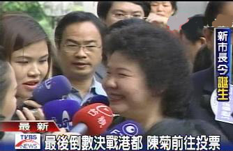 民進黨高雄市長候選人陳菊在民進黨主席游錫堃以及高雄市代理市長葉菊蘭的陪同下完成投票。陳菊表示壓力很大,對于高雄市長選舉,不能有萬一。陳菊說高雄市長選舉的勝負差距應該不會很大,無論選民做什么決定都接受。陳菊說她的心情雖然緊張,但對于高雄選民有信心,對選情有把握。(季水)