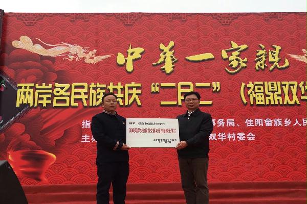 中華一家親·兩岸同胞在福建福鼎共慶二月二會親節(jié)。活動中,國家民委港澳臺辦分別為福鼎市佳陽鄉(xiāng)雙華村、太姥山鎮(zhèn)綠野山莊授予“海峽兩岸少數(shù)民族交流與合作基地示范點”牌匾。(圖片來源:國家民委網(wǎng)站)