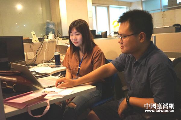 芒果師傅帶著陳姿云觀看團隊制作的往期節目,熟悉團隊工作。(圖片來源:湖南省臺辦)