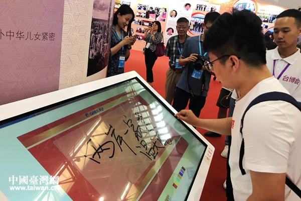 北京聯合大學研究生溫天鵬觀展后留言“兩岸一家親”。(中國臺灣網 趙苗青 攝)
