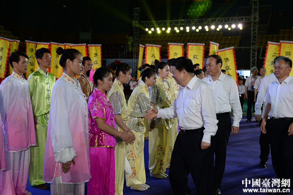 國(guó)務(wù)院臺(tái)辦副主任龍明彪等人與參加武術(shù)表演人員握手。(圖片來(lái)源:河北臺(tái)辦)