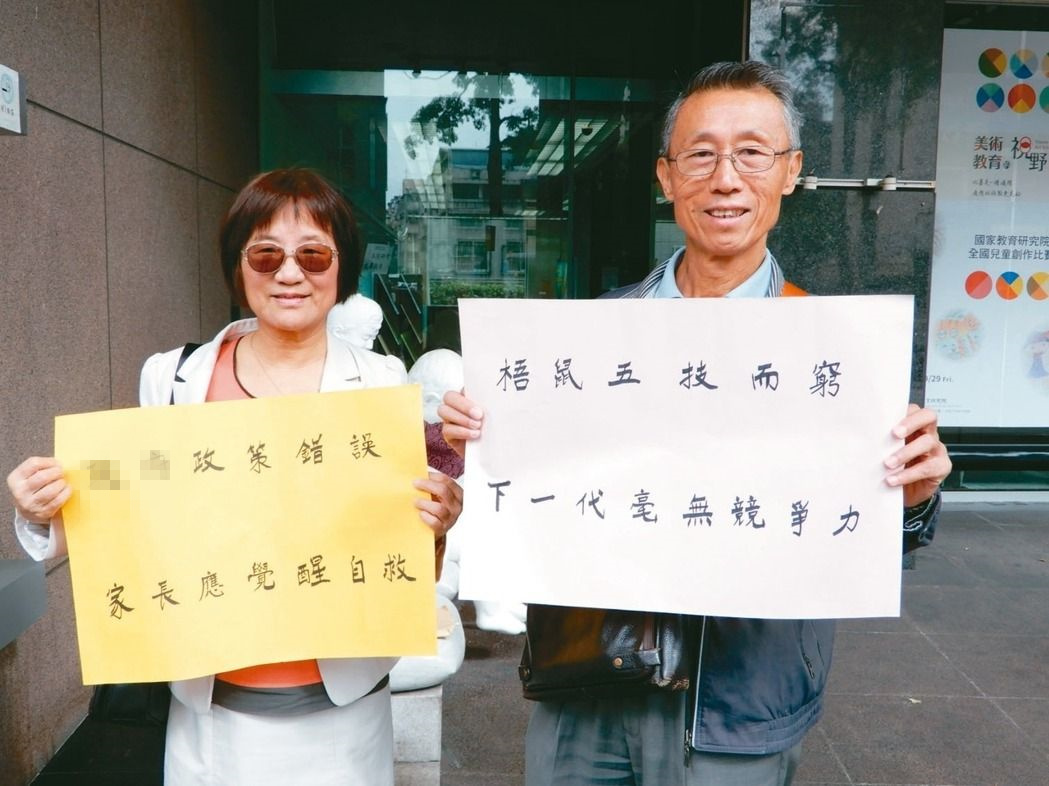 臺灣退休老師手拿標語抗議,指刪減文言文比率是教育自宮、自殘。 (圖片來源:臺灣《聯合報》)