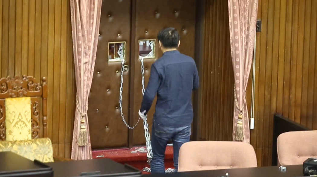議場內(nèi)大門玻璃被敲碎,并用鎖鏈鎖住。(圖片來源:臺(tái)灣《中時(shí)電子報(bào)》)