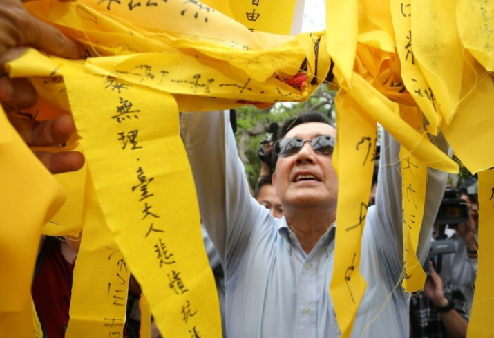 馬英九親自在傅鐘下系上黃絲帶,黃絲帶上寫著:“學術自由要堅持,大學自治不可棄,‘教育部’粗暴無理,臺大人悲憤抗議,五四九九周年,馬英九校友寫于傅鐘下。”