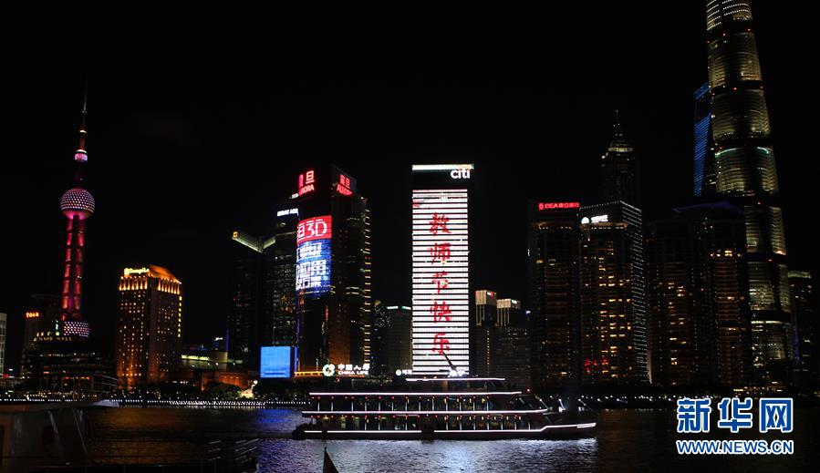9月9日,上海外灘地標亮燈慶祝教師節,來自同濟大學、上海理工大學的學生現場向敬愛的老師獻上祝福。 新華社記者 胥曉璇