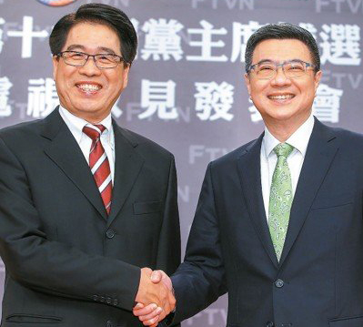 民進黨黨主席補選昨天舉行電視政見發表會,候選人卓榮泰(右)和游盈。ㄗ螅┫任帐种乱。(圖片來源:臺灣《聯合報》)