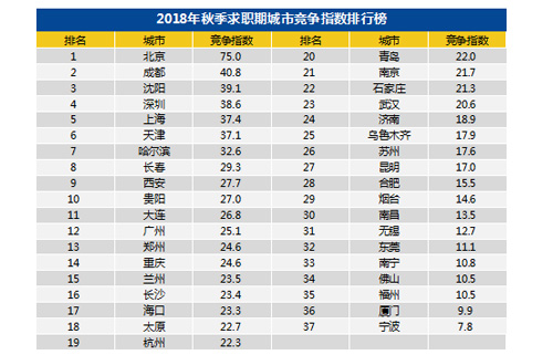 數據顯示,2018年秋季求職期北京的競爭指數依然高居第一位,為75.0,同比略有下降,競爭程度趨緩。值得注意的是,成都的競爭指數排名上升至第二位,報告分析稱,直接體現為成都的簡歷投遞量遠高于職位發布量。成都在人才吸引方面的政策發揮了作用,但同時地方產業和經濟發展對人才的需求未能同步跟上人才供應的速度,在人才消化方面還需更多努力。