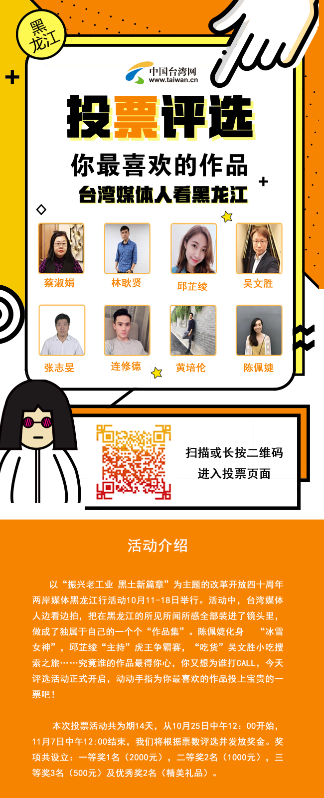 本次投票活動共為期14天,從10月25日中午12:00開始,11月7日中午12:00結束,我們將根據票數評選并發放獎金。獎項共設立一等獎1名(2000元),二等獎2名(1000元),三等獎3名(500元)及優秀獎2名(精美禮品)。