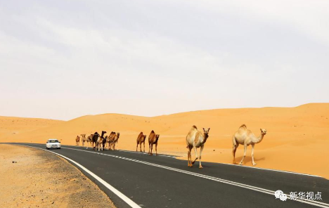 2016年5月6日拍攝的阿聯酋的利瓦沙漠公路上的駝隊。 新華社記者 李震攝