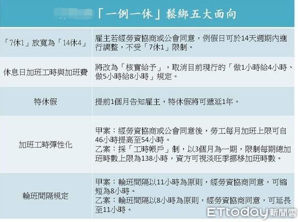 除了“松綁七休一”外,臺“勞動部”也打算取消現行“做1算4”“做5算8”的加班費規定,改依實際時數計算。另外,還有“延長工時上限”“特休假遞延”“輪班間隔”等五大方面的新舉措。