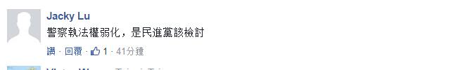 對此,臺灣的民眾也是紛紛為警察叫屈:根據臺灣旺旺中時媒體集團的民調顯示,有59.9%的民眾認為目前臺灣司法機構或相關規定不夠保障警察依法行使公權力的,更有高達90.1%的民眾認為公權力不彰會影響社會治安。