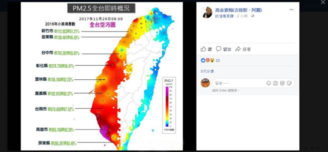 臺灣無黨籍“立委”高金素梅今天(1日)在“臉書”貼出11月29日8點,全臺空氣污染圖,并在圖上標注出2016年臺灣地區領導人選舉時,當選者蔡英文在島內某些縣市的得票數,結果得出一個驚人結論:幾乎是越挺蔡英文的地方,污染越嚴重;臺灣人“越挺民進黨就越慘”!