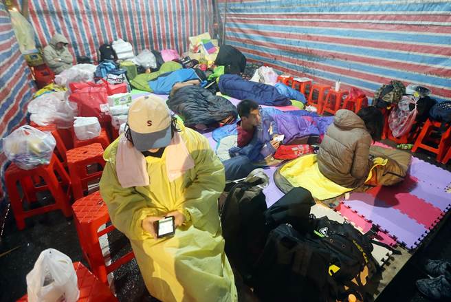 臺灣勞團發動夜宿“立法院”行動,勞團在寒流中于“立法院”外夜宿。(圖片來源:臺灣《中時電子報》)
