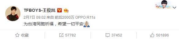 地震發生后,黃曉明、TFboys等明星們均在微博中為花蓮災區民眾祈福,表示“愿大家平安”。