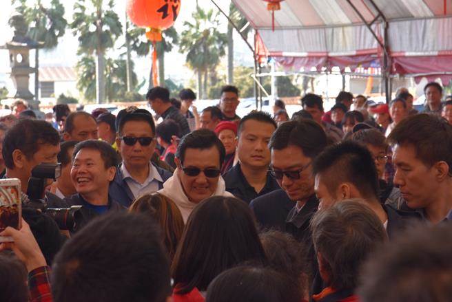 臺灣地區前領導人馬英九(白衣者)17日至新竹縣義民廟上香、贈春聯,人氣不減。(圖片來源:臺灣“中時電子報”)
