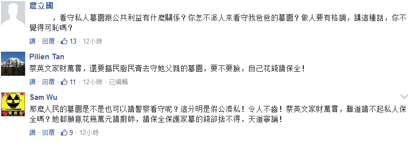 蔡英文父親的墳墓超過規定200多倍,還因此被新北市罰了456萬新臺幣,要求改善。結果蔡英文家族交了罰款就不了了之,完全沒有改動。警察守墓也就算了,守的還是一個超級大違建,你說氣人不氣人!