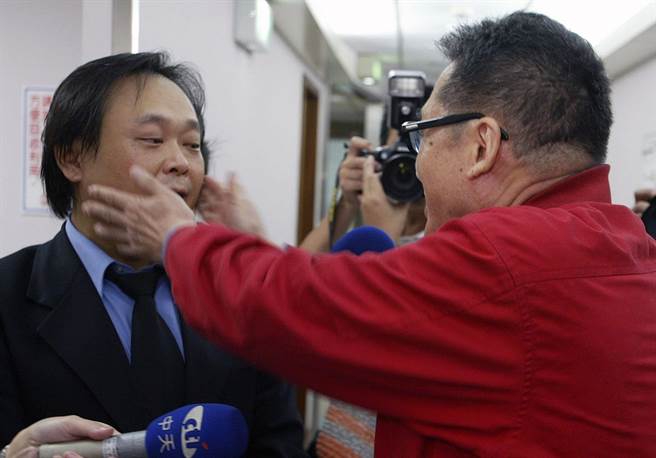 2005年,王世堅不滿李敖言論影響個人名譽,到李敖辦公室要找他理論,兩人在走道上展開言語辯論,李敖摸著王世堅的臉頰說“小老弟,不要再鬧了,肚子餓了,趕快回去吃飯吧!”(圖片來源:臺灣《中時電子報》)