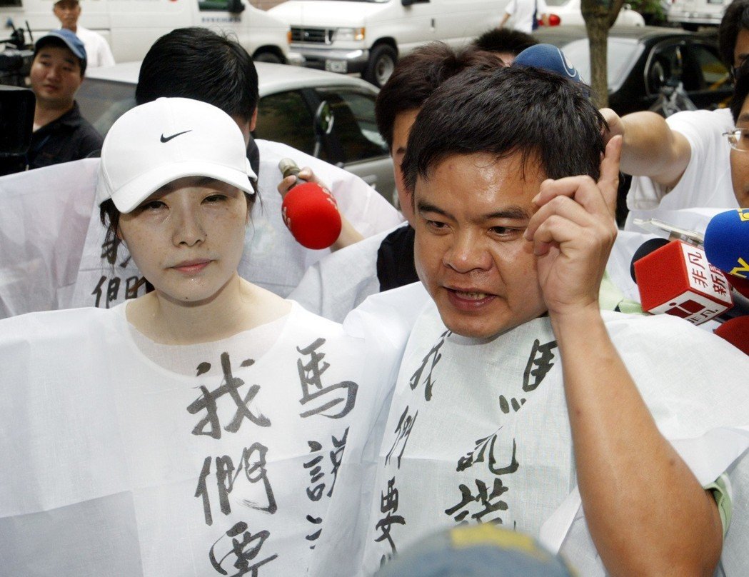 馬英九特別費案獲判無罪,當時臺北市議員顏圣冠(左)、莊瑞雄到法院外表達對判決的不滿。(圖片來源:臺灣《聯合報》)